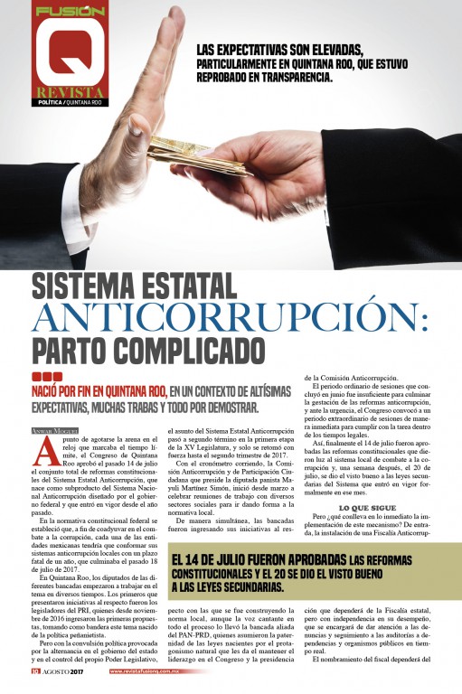 QUINTANA ROO, México.- A punto de agotarse la arena en el reloj que marcaba el tiempo límite, el Congreso de Quintana Roo aprobó el pasado 14 de julio el conjunto total de reformas constitucionales del Sistema Estatal Anticorrupción, que nace como subproducto del Sistema Nacional Anticorrupción diseñado por el gobierno federal y que entró en vigor desde el año pasado.