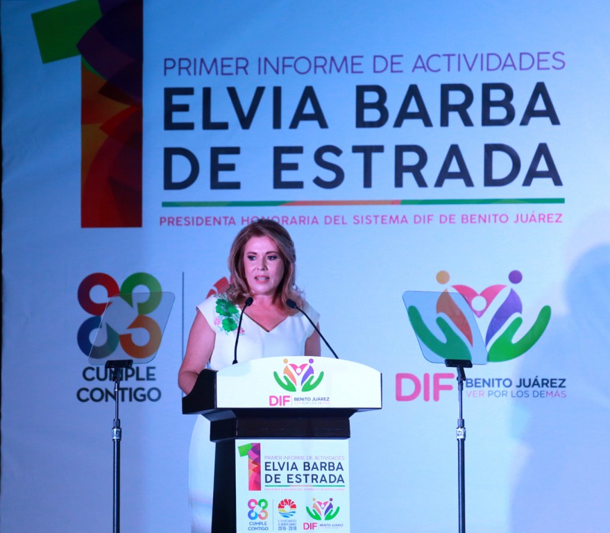 Cancún, Q. Roo, a 15 de noviembre de 2017. La labor humanitaria y de asistencia social del DIF Benito Juárez está cambiando vidas y es el reflejo de las políticas públicas del Presidente municipal, Remberto Estrada Barba, expresó al rendir su Primer Informe de Actividades la Presidenta Honoraria del Sistema para el Desarrollo Integral de la Familia (DIF) Municipal, Elvia Barba de Estrada.