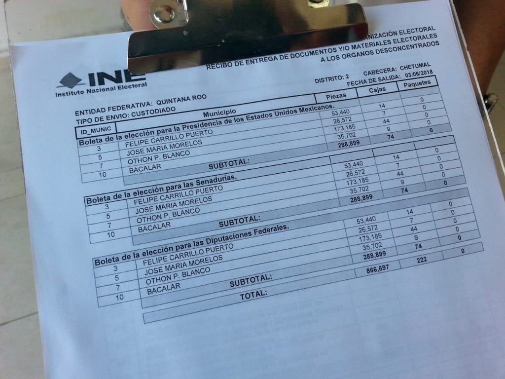 De estas, 53 mil 440 se emplearán en Felipe Carrillo Puerto; 26 mil 572 en José María Morelos; 173 mil 185 en Othón P. Blanco y 35 mil 702 en Bacalar. Por ahora permanecerá concentrado en las bodegas de la Junta Distrital 2 del Instituto Nacional Electoral (INE) en Chetumal.