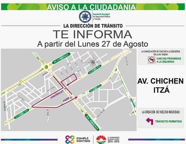 Cancún, Q. Roo, 26 de agosto de 2018.- La Dirección de Tránsito informa que como parte de las medidas para reducir los tiempos de recorrido en las principales avenidas del municipio con la puesta en operación de los pares viales en las avenidas Cobá y Xcaret, este lunes entrará en funciones la cancelación de la vuelta a la izquierda en la avenida Kabah con su cruce con avenida Chichen Itzá.