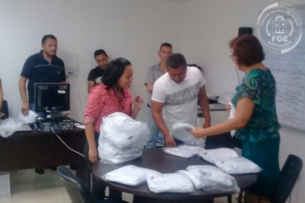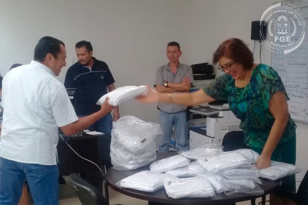 Chetumal, Quintana Roo; 4 de septiembre del 2018. La Fiscalía General del Estado informa que, la Fiscal Especializada en Combate a la Corrupción, Rosaura Villanueva Arzápalo, entregó uniformes al personal que labora en este órgano, como parte de las acciones de mejoramiento del entorno laboral y permitirá que la ciudadanía pueda identificar a los integrantes de la misma.