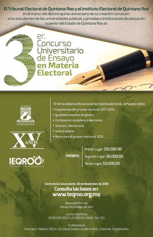 Chetumal, Q. Roo a 12 de septiembre de 2018.- El Tribunal Electoral de Quintana Roo y el Instituto Electoral de Quintana Roo convocan a los universitarios de la entidad a participar en el Tercer Concurso Universitario de Ensayo en Materia Electoral.