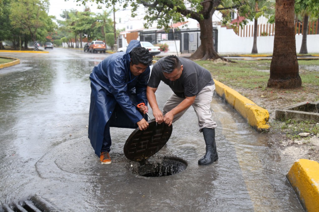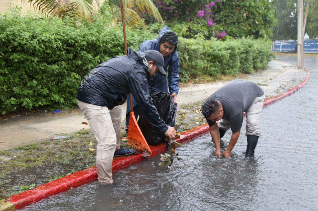 El director de Pozos y Limpieza de Playas, Ubaldo Alejandro Robertos Canul, informó que continúan brindando atención puntual en las zonas que presentan mayor encharcamiento, realizando labores de limpieza de las rejillas y recolectando desechos sólidos, con el objetivo de que fluya con mayor rapidez el agua en las alcantarillas y se despejen las vialidades.