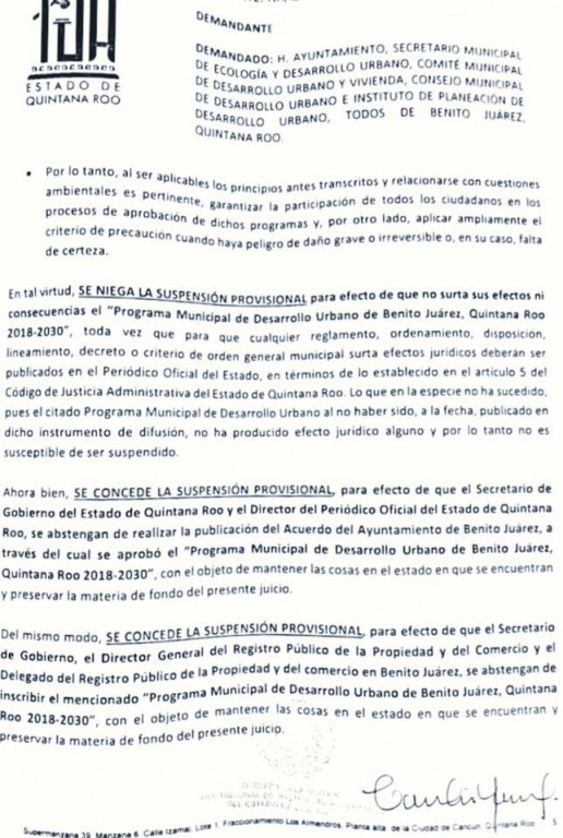 Lo anterior, fue dado a conocer por la asociación en su cuenta de Facebook, donde señalan que “en virtud de que el Cabildo Municipal de BJ (Cancún) aprobó un proyecto de PDU que la ciudadanía desconoce, y ante el cual no hubo una real consulta pública, vecinos solicitaron la modificación de la suspensión de forma que ese PDU no pueda publicarse ni se pueda otorgar el dictamen/congruencia estatal que se requiere”.