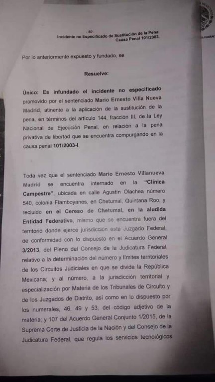 La resolución del Juzgado Tercero de Distrito del Estado de México, para el expediente 101/2003, indica que no procede el recurso de sustitución de pena “toda vez que el sentenciado Mario Ernesto Villanueva Madrid se encuentra internado en la Clínica Campestre, ubicada en la calle Agustín Olachea número 540, colonia Flamboyanes, en Chetumal, Quintana Roo y recluido en el Cereso de Chetumal, en la aludida entidad federativa, mismo que se encuentra fuera del territorio donde ejerce jurisdicción este juzgado federal”.