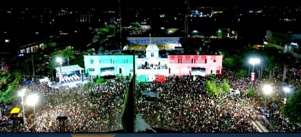 Playa del Carmen, Solidaridad, 15 de septiembre de 2022.- Ante más de 15 mil habitantes locales y visitantes, la presidenta Lili Campos dió el tradicional Grito de Independencia desde el palco del Palacio Municipal, ondeando la bandera de México y repicando la campana.