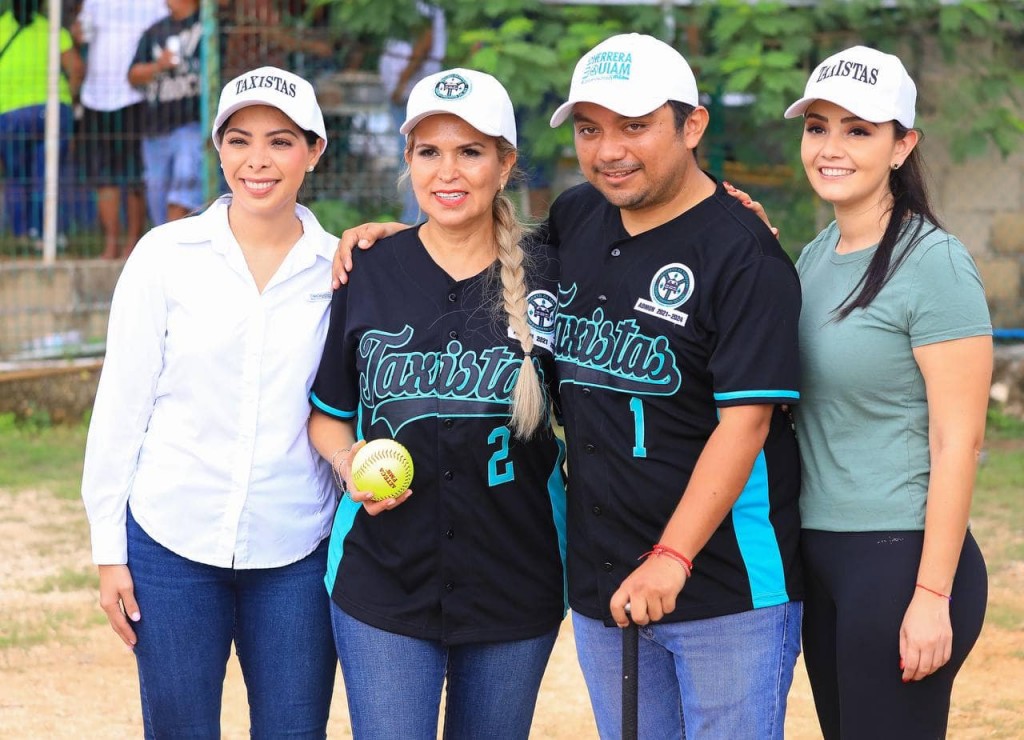 La presidenta municipal Lili Campos junto con Luis Herrera Quiam secretario general del sindicato de taxistas Lázaro Cárdenas del Río, hicieron el lanzamiento de la primera bola del encuentro amistoso de softbol entre las Monarcas de Playa del Carmen y las Diablillas de Hondzonot.