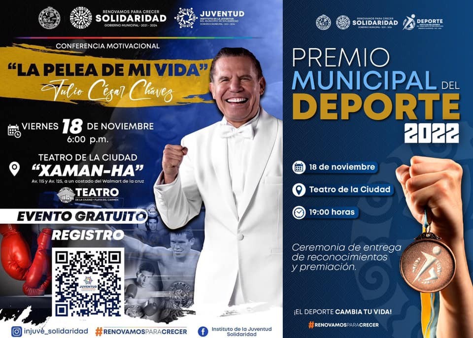 Playa del Carmen, Solidaridad a 14 de noviembre.- Acompañada del gran campeón mundial de boxeo, el mexicano Julio César Chávez, quien dará una platica motivacional, la presidenta Lili Campos hará entrega del Premio Municipal del Deporte 2022 a los ganadores de las diferentes modalidades, el próximo viernes 18 de noviembre desde las 18 horas en el teatro de la ciudad.
