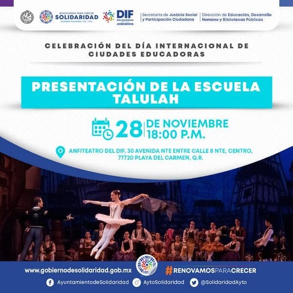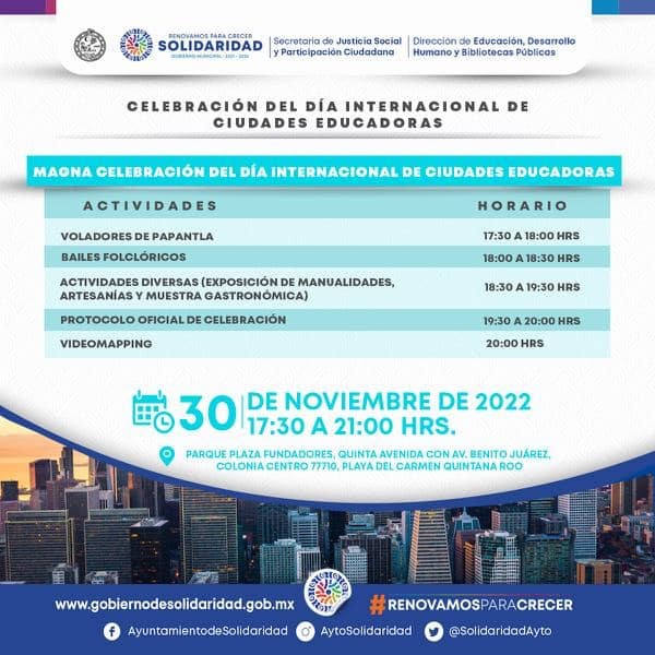 Playa del Carmen, Solidaridad, 27 de noviembre 2022.- Continuando con la atención a la educación, serán con tres días de festejos en distintas sedes, como el gobierno que encabeza Lili Campos celebrará la 32ª edición de Ciudades Educadoras, los próximos 28, 29 y 30 de noviembre.