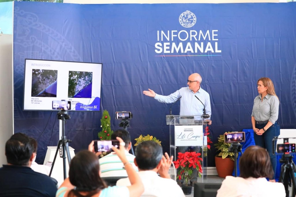 Playa del Carmen, Solidaridad, 20 de diciembre del 2022.- Cumpliendo con el compromiso adquirido la semana pasada, en el informe de hoy la presidenta Lili Campos presentó a Paul Rangel, director general de Aguakan, para informar sobre las soluciones implementadas para atender el problema de abastecimiento de agua, heredado de administraciones anteriores.