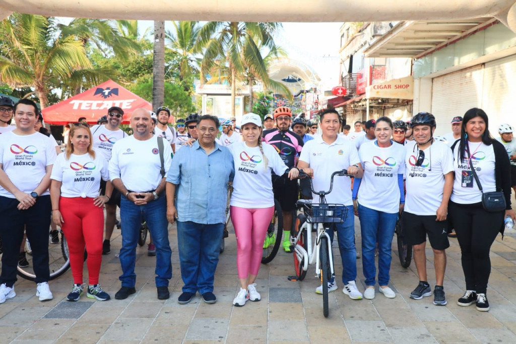 PLAYA DEL CARMEN, Q. ROO.- En apoyo e impulso al turismo deportivo en este destino vacacional, la presidenta Lili Campos encabezó el arranque de salida del Gran Fondo World Tour, en la Quinta Avenida, que se realizó por primera vez en América Latina y en Playa del Carmen, en el que participaron más de 200 ciclistas semi profesionales y profesionales.